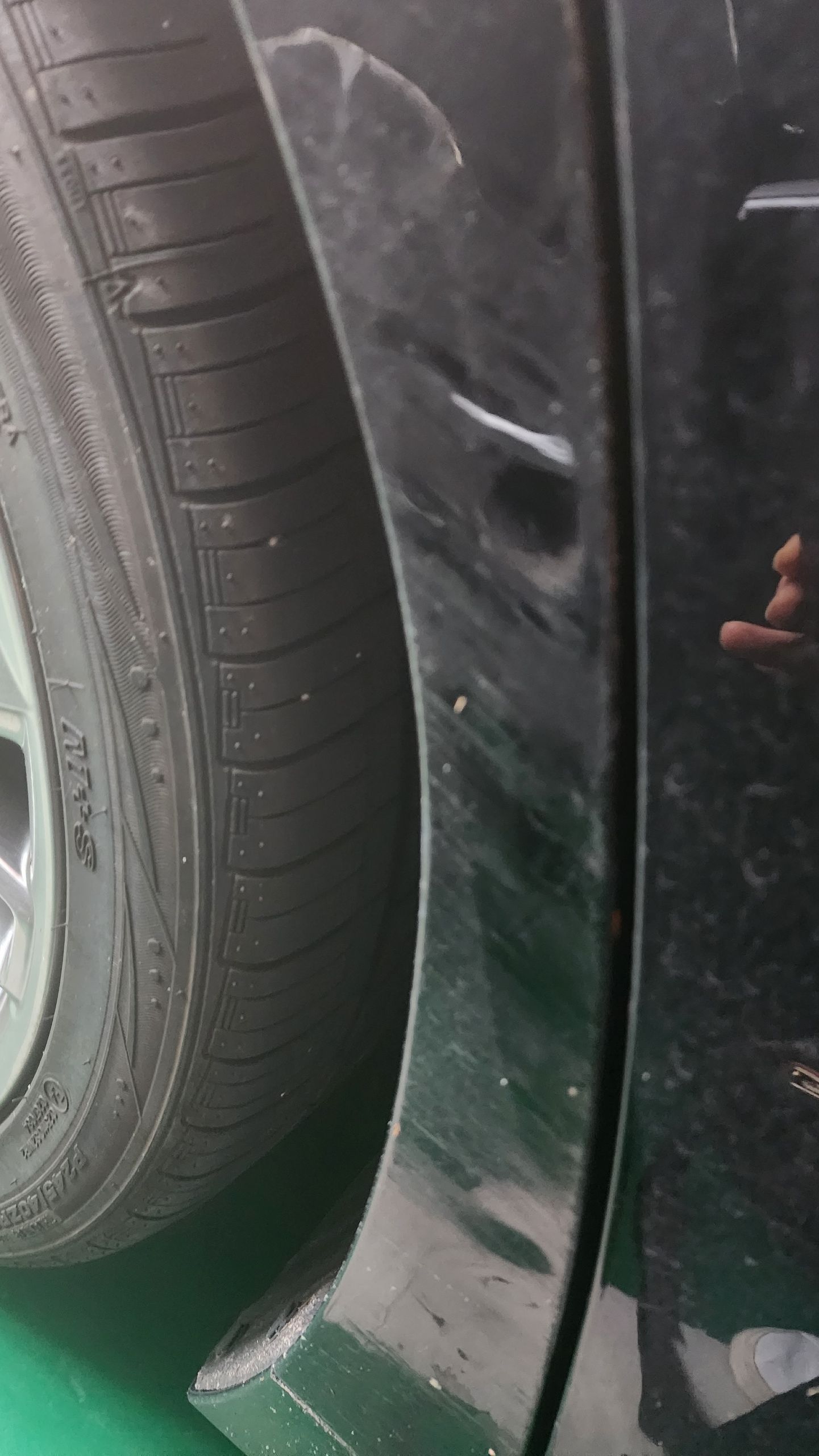 조수석 후 펜더 쓸림으로 찌그러진 상태.