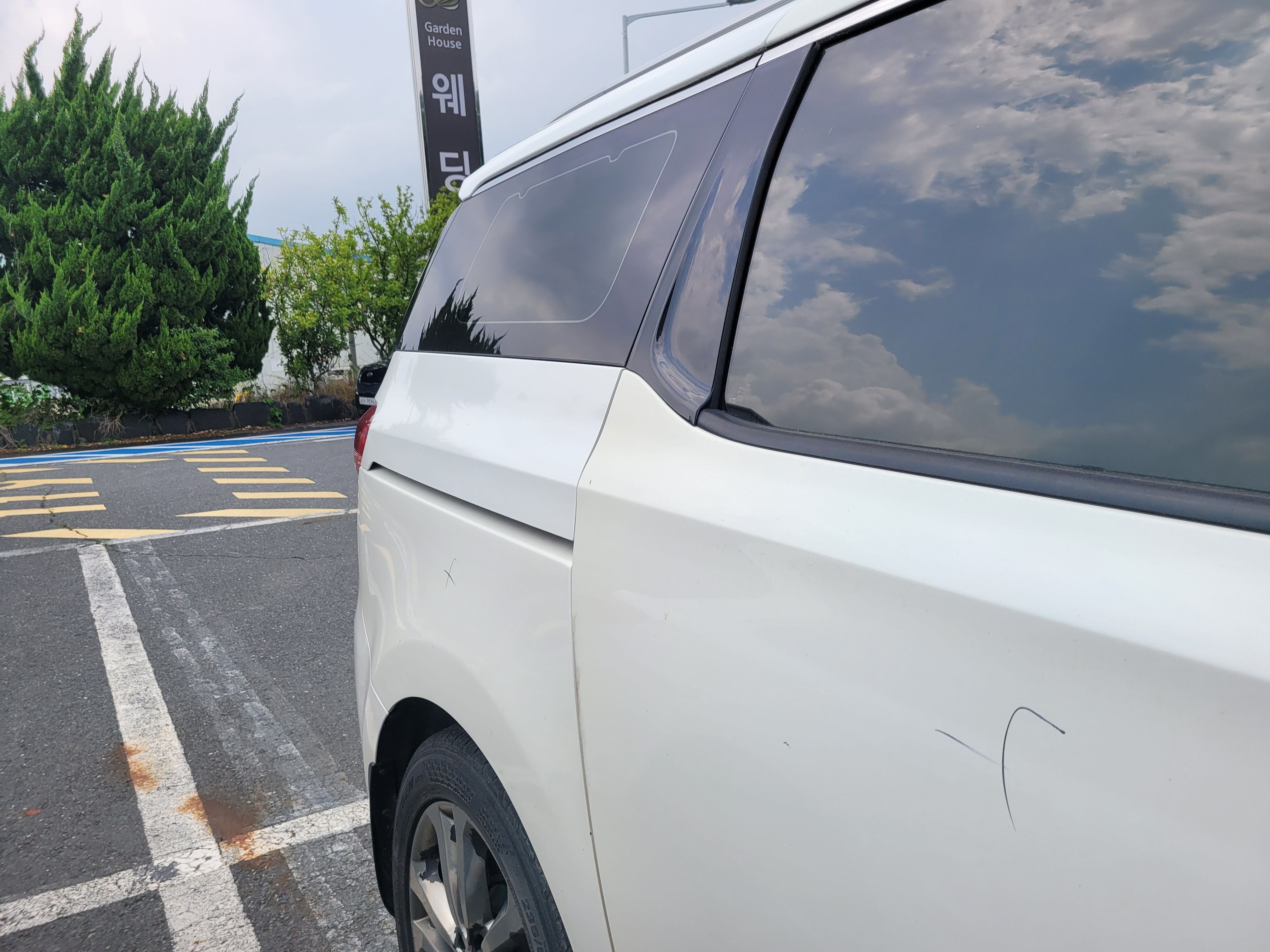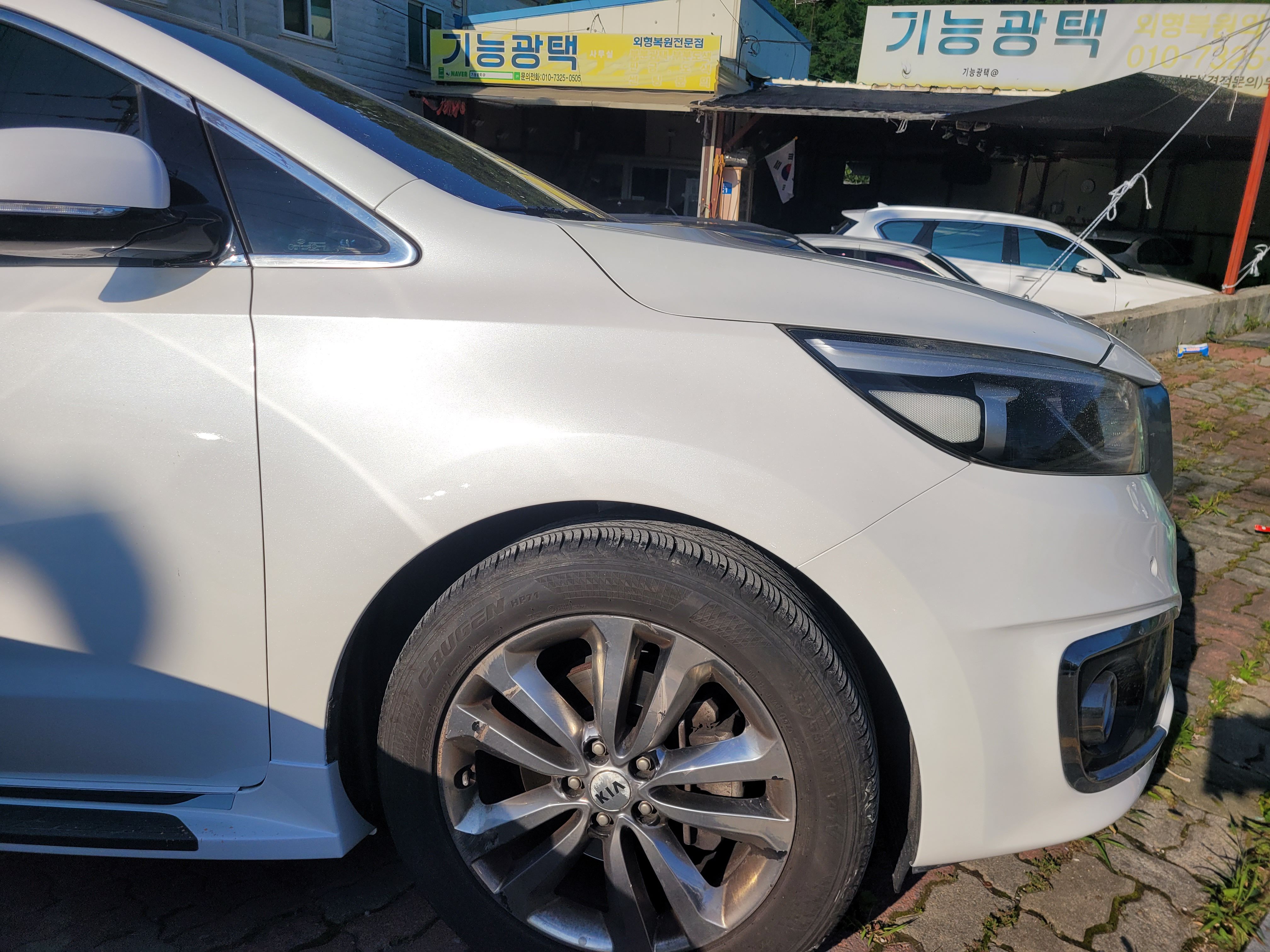 사진으로 보시듯 범퍼와 휀다 그리고 본넷 이색감이 확실하게 덜하죠? 그리고 뒷문짝까지 완전 이색감있는 도장면은 함께 재도장을 진행하였습니다. 새차출고할때의 밝은 화이트펄 색상과 시간이 지나면서 살짝 누렇게 변하가는건 어쩔 수 없는 자연현상입니다. 그런데 변색된 색상을 맞추기위해 억지로 조색을해서 진행한다면 당장은 맞아보있 수 있지만 시간이 지날수록 카니발 상태처럼 더더욱 이색감이 심해진다는걸 기억하시길 바랍니다.