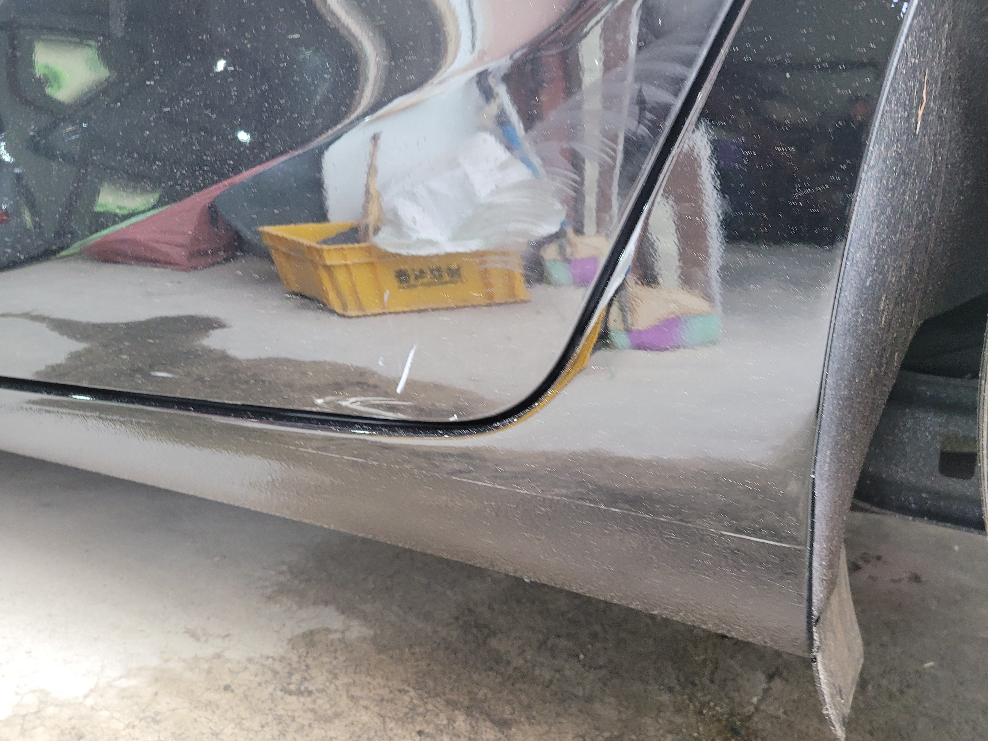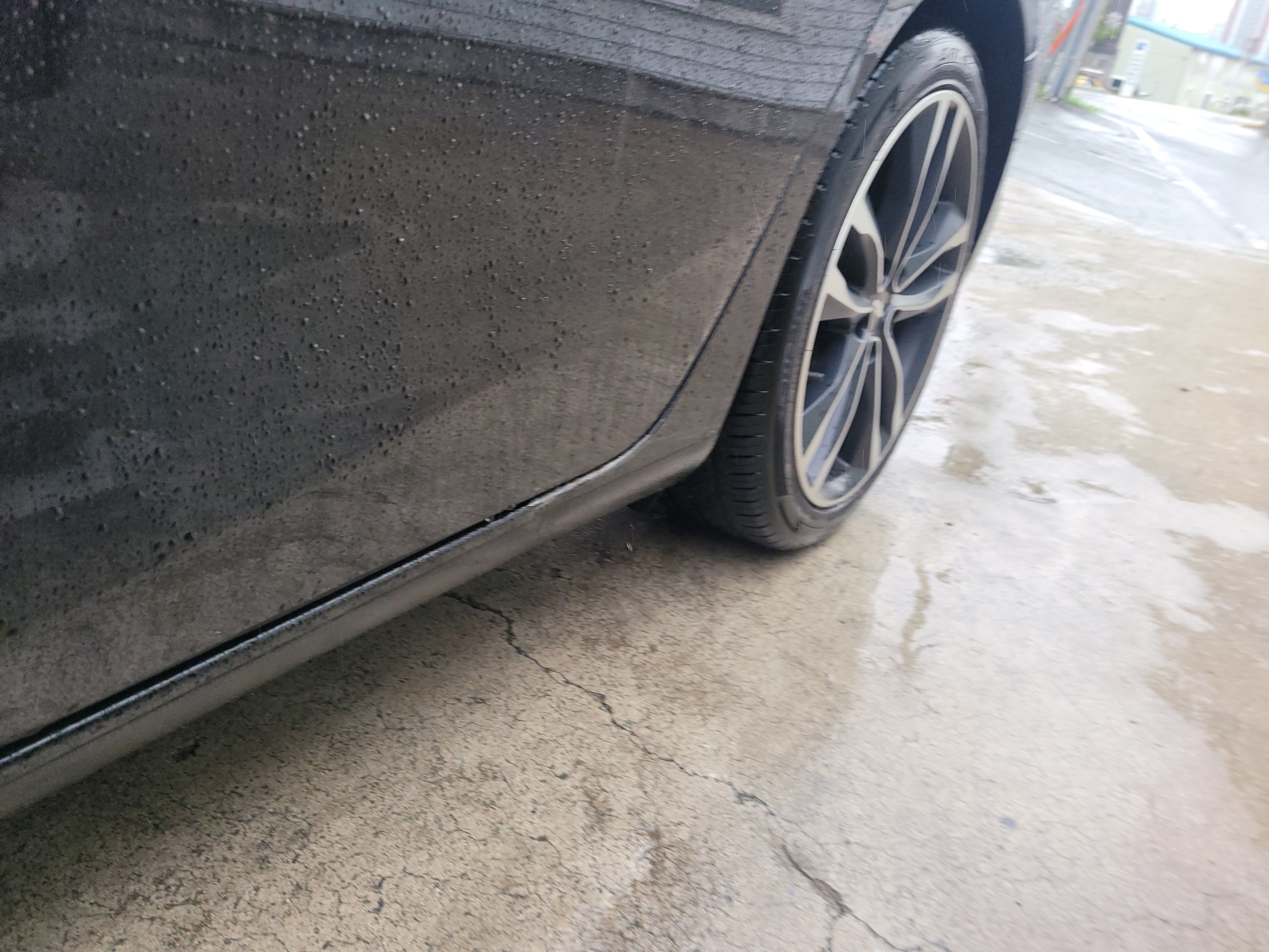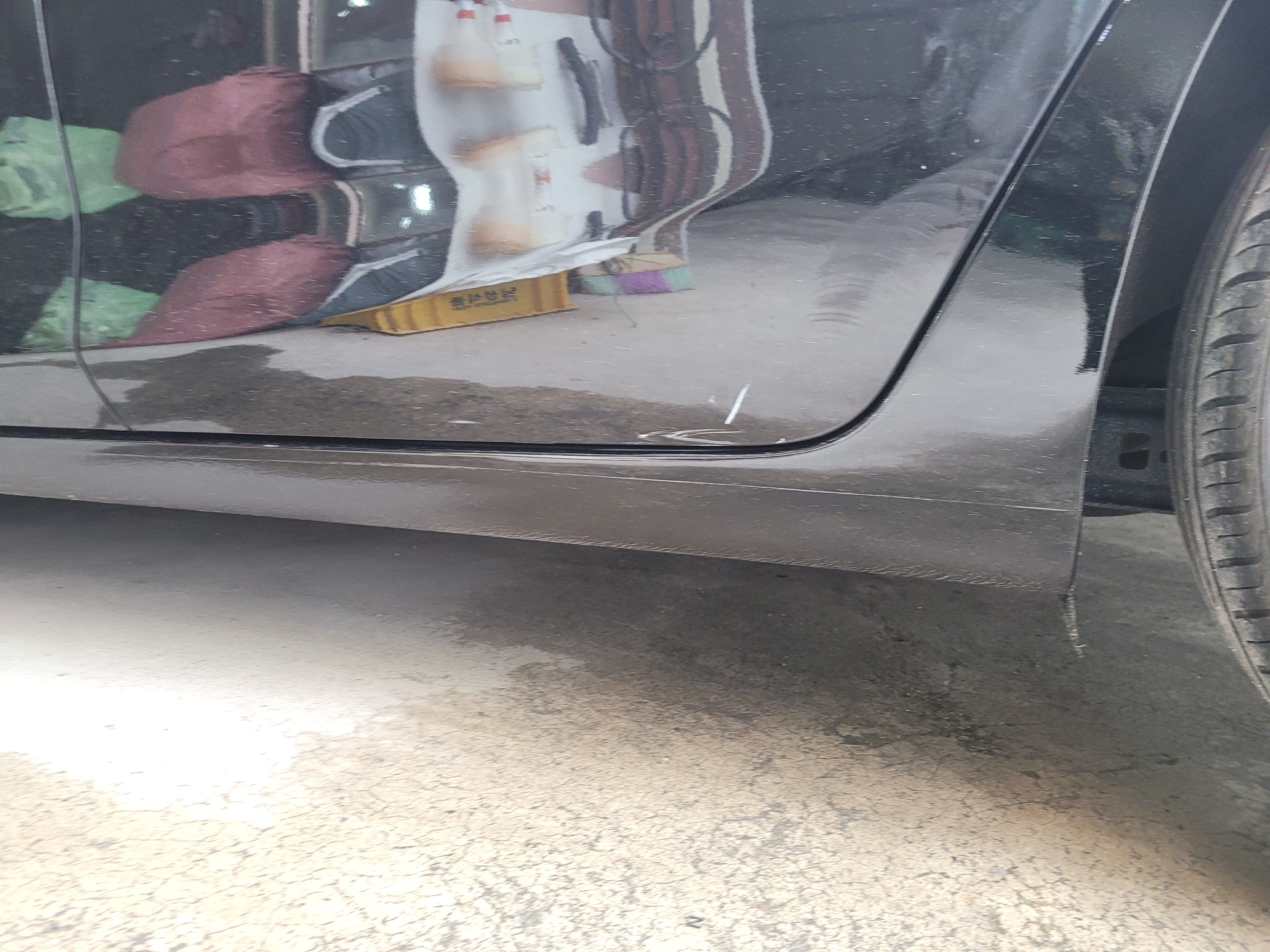 스테프몰딩 찌그러짐과 도어하단이 같이 상처가 있는 상태입니다. 이런경우 문짝을 복원한다 했을때 문짝 전체도장을 진행해야하는 상황이기때문에 차주님과의 상담에서 이 부분은 광택기로 살짝 밀어낸 후 예술적인 붓터치로 부식을 방지하는 방법으로 서비스 해드리기로 하였습니다.